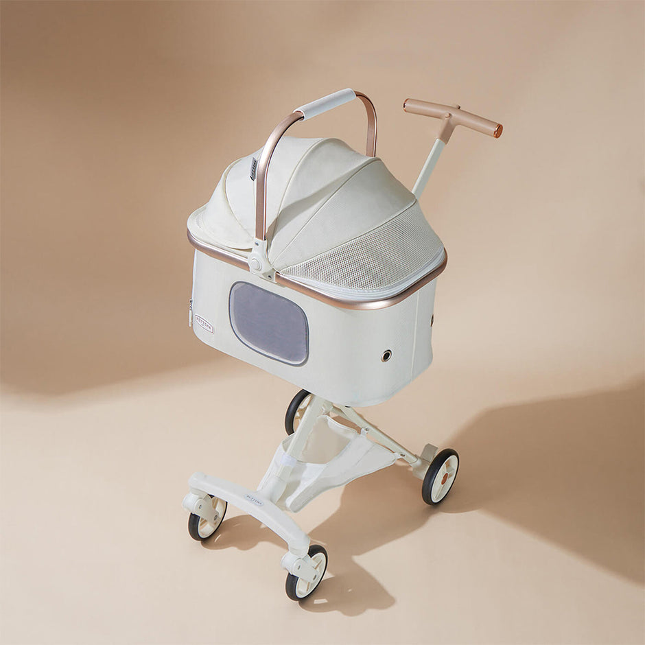 I took my pet to the nearby park in the new pet stroller🌼🐝This stroller is so stylish and cute, especially the color🥹🤍Adjusting the handle and removing the cart part is so easy and convenient!