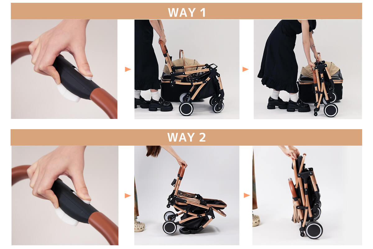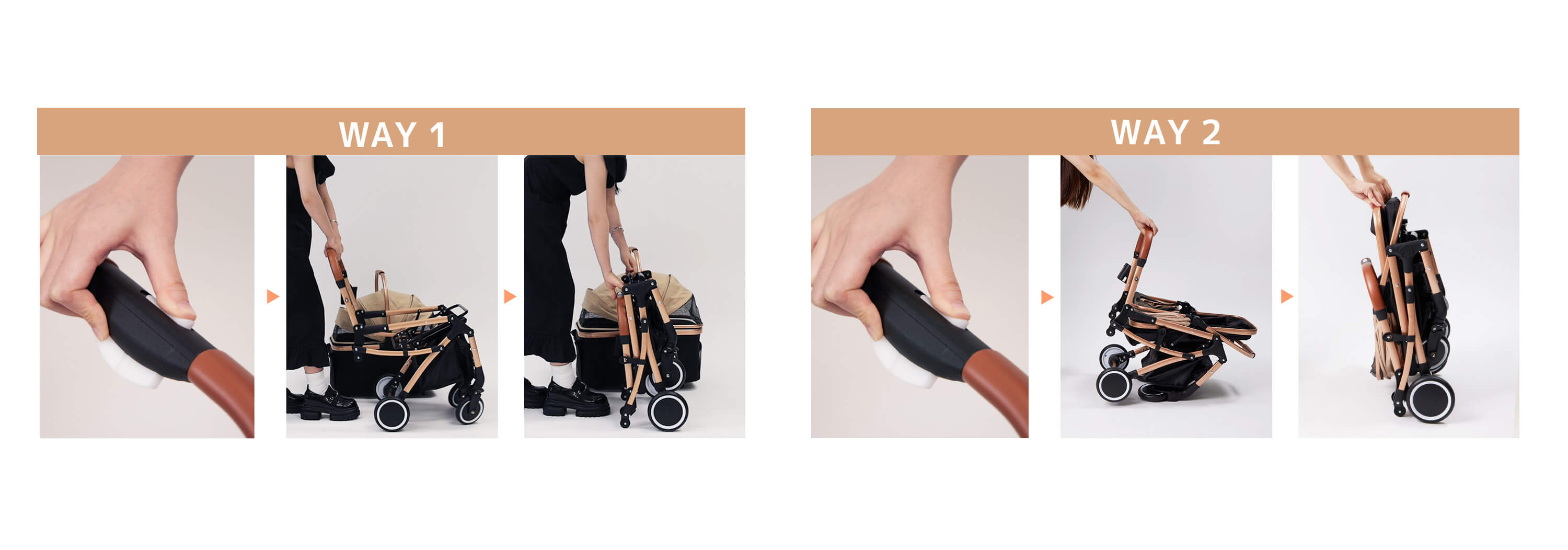1) Push the upper button on the handle to the left, and hold the lower button at the same time to fold the stroller.