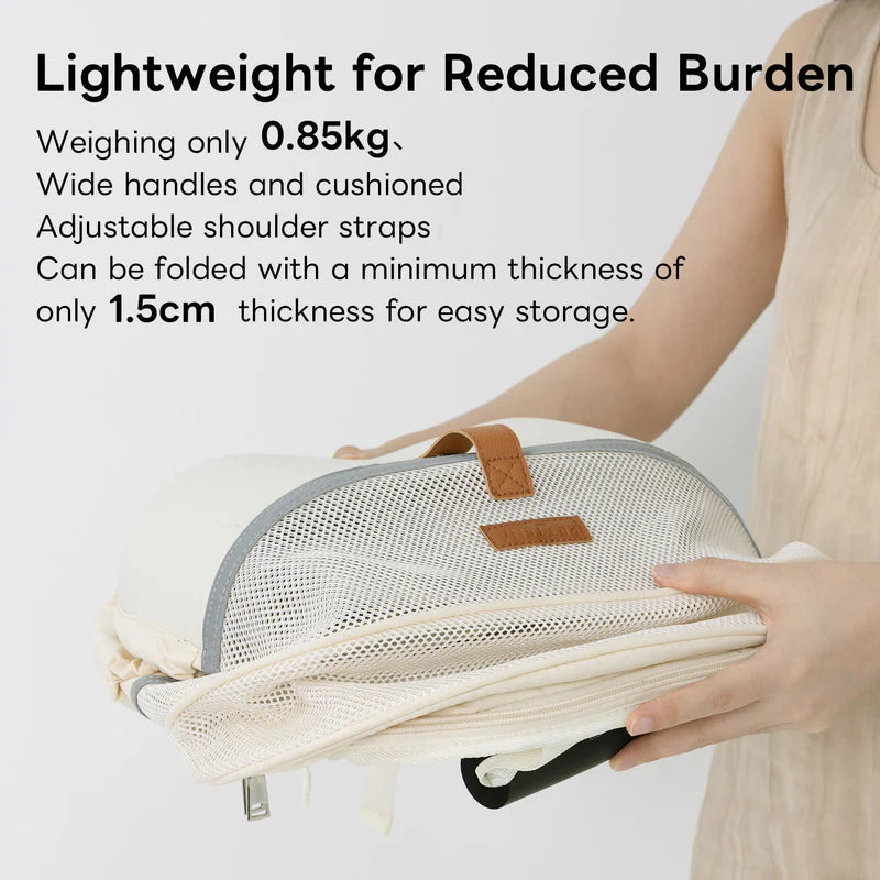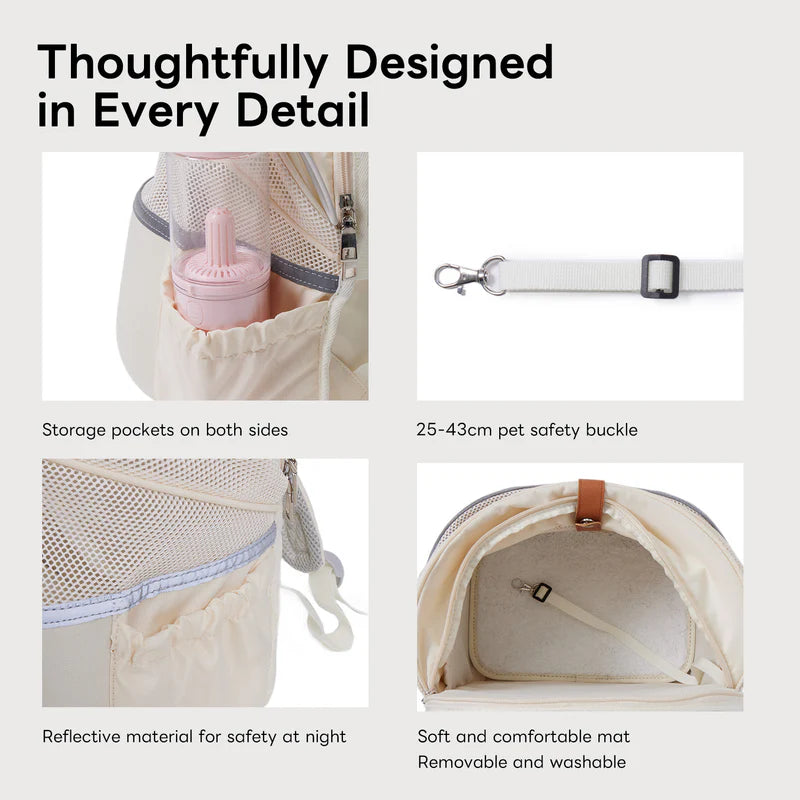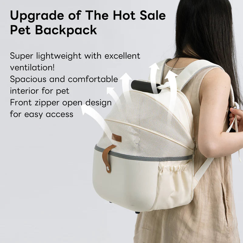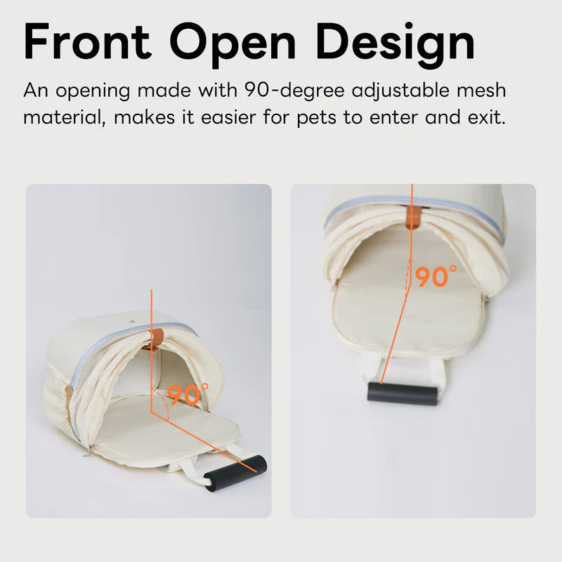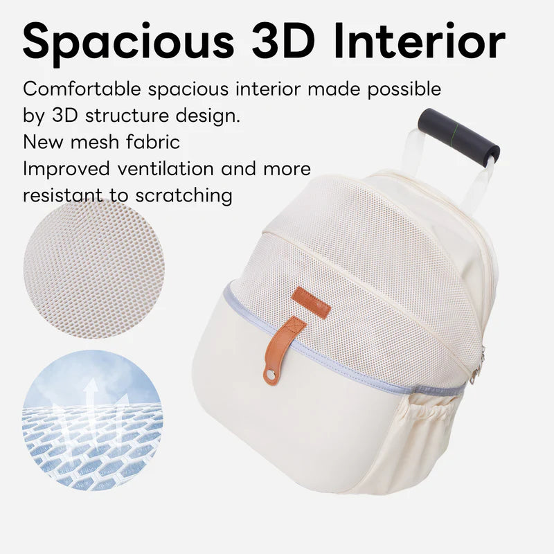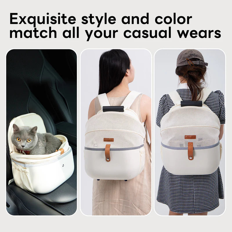 A2: It is made of high-quality and durable polyester and sturdy mesh material. It is waterproof, scratch-resistant, and easy to care for. The adjustable cotton shoulder strap reduces shoulder burden. The interior of the backpack has a cushioned bottom board, providing a comfortable resting space for pets.