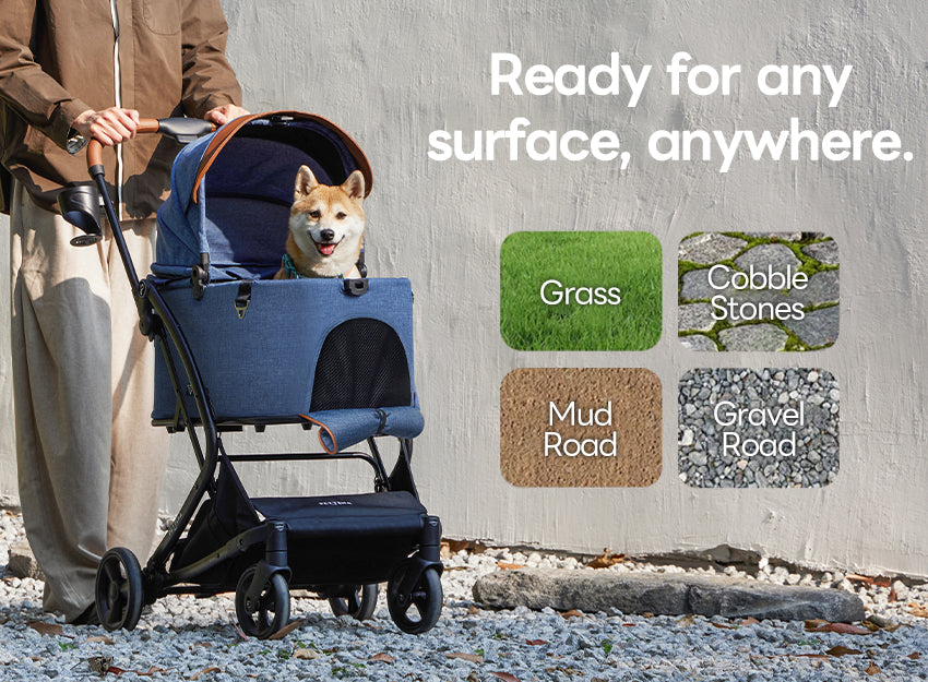 Certified to EN1888 baby-stroller standards and built with shock-absorbing suspension, MILOU keeps every ride smooth and safe for corgis, senior cats, and all pets who deserve comfort on the go.
